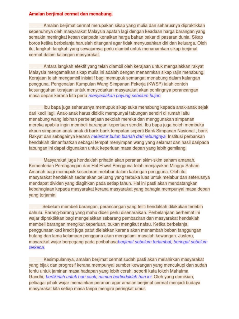 Rasuah amat bahaya di negara ini apabila diamalkan secara meluas. Contoh Karangan PT3 Cara-Cara Memupuk Amalan Berjimat Cermat Berjimat cermat merupakan amalan yang baik dan perlu dipertingkatkan dari semasa ke semasa. Selain isu berkaitan kesihatan dan perpaduan isu berkaitan ekonomi diri atau negara kerap.